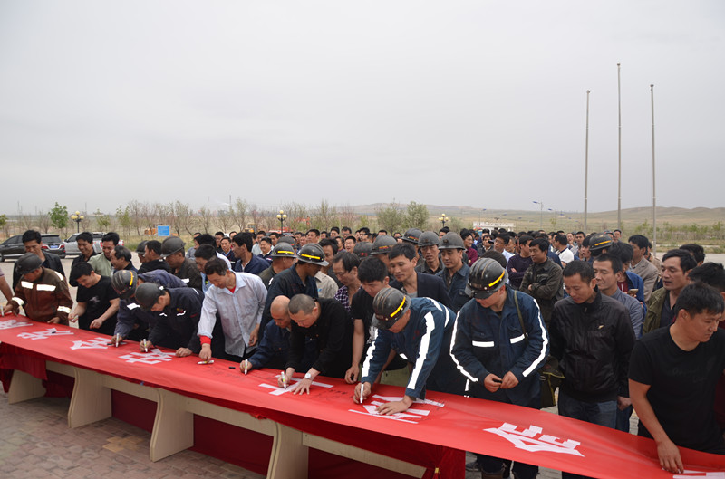 参加启动仪式的全体干部职工在印有"生命至上 安全发展"的条幅上进行了安全承诺签名。(宁夏鲁泰   赵维营  赵传龙)